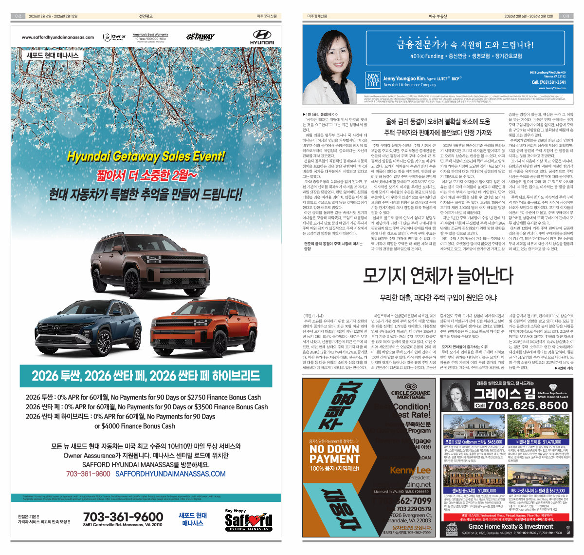 2024 년 9 월부터 연준이 기준 금리를 인하하 기 시작했지만 모기지 이자율은 떨어지지 않 고 오히려 상승하는 현상을 볼 수 있다. 어쩌 면, 주택 시장이 2025 년에 특히 부진하고 빙하 기에 가까운 시점에 도달한 것이 바로 모기지 이자율 하락에 대한 기대감이 실현되지 않았 기 때문으로 볼 수 있다. 이처럼 모기지 이자율이 떨어지지 않은 이 유는 장기 국채 수익률이 높아졌기 때문인데 이는 국가 부채가 늘어난 데 기인한다. 만약 장기 채권 수익률을 낮출 수 있다면 모기지 이자율은 하락할 수 있다. 트럼프 대통령이 모기지 채권 2,000 억 달러 어치 매입을 명령 한 이유가 바로 이 때문이다. 지난 3 년간 주택 거래량이 수십 년 만에 최 저 수준에 머물며 부진했던 주택 시장이 2026 년에는 조금씩 정상화되기 위한 방향 전환을 할 수 있을 것으로 보인다. 이미 주택 시장 활동이 개선되는 조짐을 보 이고 있다. 오랫동안 팔리지 않았던 주택들이 계약되고 있고, 거래량이 증가하면 가격도 상