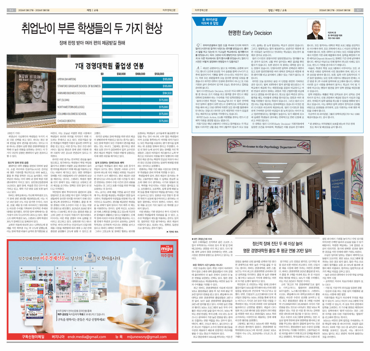 취업난이 극심해지자 학생들은 두가지 서 로 다른 선택을 하고 있다. 하나는 정신 장 애 판정을 받아 편의를 받으려는 것이고 다 른 하나는 경쟁이 심한 명문 경영대학원을 진 학해 더 높은 연봉을 성취하는 것이다. 이 두 가지 극단적 성향은 팬데믹이 낳은 결과라고 할 수 있다.