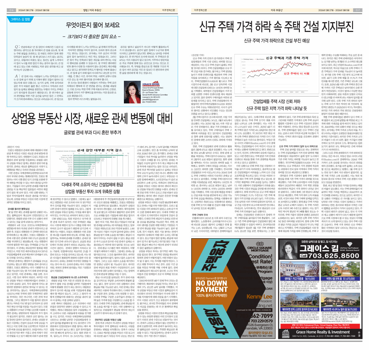 나다. 하지만 개인 주택 판매자들은 아직까지 는 호가를 낮추는 데 훨씬 더 소극적인 태도를 보이고 있다. 최근 리얼터( Realtor. com) 의 분 석에 따르면, 역사상 처음으로 신축 주택이 기 존 주택보다 가격 인하될 가능성이 더 높아졌 다. 분기별 신축 주택 시장 분석 보고서에 따 르면, 4 분기 신축 주택 매물 중 19.3 % 가 가격 인하를 제시한 반면, 기존 주택은 18 % 에 그쳤 다. 또한, 2025 년 4 월 이후 신축 주택의 중간 판 매 가격이 기존 주택보다 낮아지면서 오랜 추 세가 역전되었다. 이것이 얼마나 이상한 현상 인지 이해하려면, 같은 차종과 모델의 신차보 다 중고차를 더 비싸게 파는 자동차 딜러를 생 각해 보면 된다. 신축 주택 가격 하락의 일부 는 주택 크기가 약간 작아진 데 기인하며, 일 반적인 평면도가 2022 년보다 약 5 % 작아졌다. 하지만 가격 하락의 주된 원인은 건설업체의 분양가 인하와 할인 때문이다. 개별 주택 판매자들은 팬데믹 당시 주택 구 매 열풍이 최고조에 달했을 때 책정된 최고 가 격에 대한 기대감을 쉽게 버리지 못하고 있지 만, 2026 년에는 이런 상황이 바뀔 것으로 예상 한다. 과거에는 주택 가격과 소득의 비율, 즉 3 대 1 이라는 비율이 오랫동안 통용되어왔던 일 반적인 기준이었다. 하지만 주택 가격과 소득 의 비율이 5 대 1 이 되면, 젊은 가구들이 연방 주택국 모기지 융자의 3.5 % 계약금이든 일반 모기지 융자의 10 % 계약금이든 간에 저축하 기가 더 어려워진다. 그러나 모든 주택 경제학자가 가격 하락에 동 의하는 것은 아니다. 부동산 정보 사이트 리얼 터( Realtor. com) 의 경제학자는 2026 년 주택 가격이 소폭 상승할 것이라는 자신의 전망을 재차 강조했다. 호가를 보면 올해는 소폭 상승 할 것으로 예상한다고 말했다. 1 월 주택 호가 는 전년 동기 대비 거의 변동이 없었지만, 실 제 거래 가격은 소폭 상승했다. 이는 특히 북 동부와 중서부 지역의 주택 시장 경쟁이 지속 되고 있음을 반영한다. 한편, 최근 몇 달 동안 가격을 인하하는 매물 의 비율이 감소했다. 이는 주택 판매자들이 처 음부터 적정 가격을 책정하고 2026 년까지 호 가 인하를 피하려는 것으로 보인다. 하지만 시 장 상황은 지역별로 큰 차이를 보이고 있다. 남부와 서부 지역은 시장이 침체되고 가격이 하락하는 반면, 중서부와 북동부 지역은 시장 이 활황을 보이면서 가격이 상승하고 있다. 주 택 시장의 범위가 상당히 넓고, 전국 각 지역 의 재고 상황이 제각각 다르기 때문에 일반적 으로 주택 시장에서 볼 수 있는 것보다 지역별 격차가 더 크게 벌어지고 있는 것이 주택 시장 의 모습이다. 주택 가격 하락은 신규 주택이 몰린 지역에서 일부 나타나는 현상으로 보는 것이 타당할 듯하다.