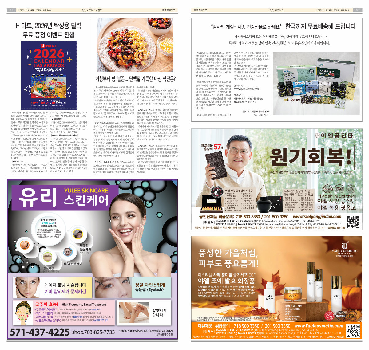 미주 최대 아시안 슈퍼마켓 체인 H 마 트가 2026년 새해를 맞아 11월 16일( 일) 부터 버지니아 및 메릴랜드 지역 전 매 장에서 무료 탁상용 달력 증정 이벤트를 진행한다. 이번 달력은 H 마트 스마트카 드 회원을 대상으로 한정 수량으로 제공 되며, 2025년 어린이 그림대회 수상작이 수록되어 있다. 또한 매장별 연락처 및 주소 정보가 포함되어 고객 편의성을 높 였다. H 마트는“ 항상 H 마트를 사랑해 주시는 고객 여러분께 진심으로 감사드 린다” 며,“ 2026년에도 고객님의 가정에 건강과 행복이 가득하길 바란다” 고 전했 다. 자세한 문의는 H 마트 매장으로 하 면 된다.