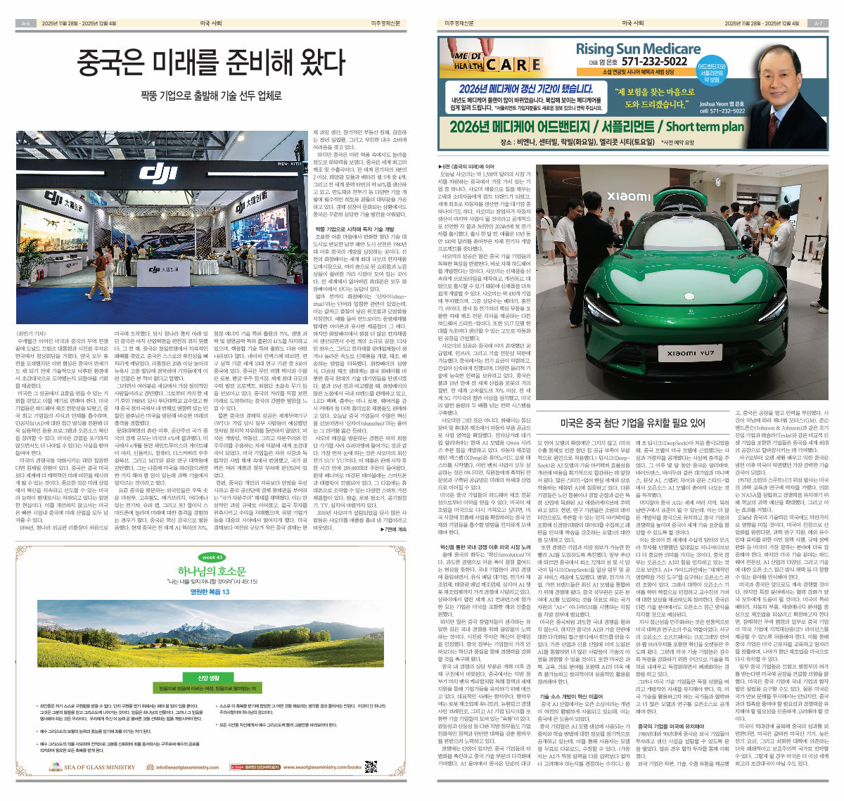 ▶6면 < 중국의 미래 > 에 이어 오늘날 샤오미는 약 1,500억 달러의 시장 가 치를 자랑하는 중국에서 가장 가치 있는 기 업 중 하나다. 샤오미 제품으로 집을 채우는 Z세대 소비자들에게 컬트 브랜드가 되었고, 세계 최초로 자동차를 생산한 기술 대기업 중 하나이기도 하다. 샤오미는 창업자가 자동차 생산이 마지막 사업이 될 것이라고 공개적으 로 선언한 지 불과 3년만인 2024년에 첫 전기 차를 출시했다. 출시 한 달 전, 애플은 10년 동 안 100억 달러를 쏟아부은 자체 전기차 개발 프로젝트를 중단했다. 샤오미의 성공은 많은 중국 기술 기업들의 독특한 특징을 반영한다. 바로 자체 하드웨어 를 개발한다는 것이다. 샤오미는 신제품을 신 속하게 프로토타입을 제작하고, 개선하고, 대 량으로 출시할 수 있기 때문에 신제품을 더욱 쉽게 개발할 수 있다. 샤오미는 약 430개 기업 에 투자했으며, 그중 상당수는 배터리, 충전 기, 라이더, 센서 등 전기차의 핵심 부품을 포 함한 자체 제조 전문 지식을 제공하는 다른 하드웨어 스타트-업이다. 또한 SU7 모델 한 대를 76초마다 생산할 수 있는 고도로 자동화 된 공장을 건설했다. 샤오미의 성공은 중국에 이미 존재했던 공 급업체, 인프라, 그리고 기술 전문성 덕분에 가능했다. 중국에서는 전기 요금이 저렴하고, 건설이 신속하게 진행되며, 다양한 물리적 기 술에 능숙한 인력을 보유하고 있다. 중국은 불과 10년 만에 전 세계 산업용 로봇의 거의 절반, 전 세계 고속철도의 70 % 이상, 전 세 계 5G 기지국의 절반 이상을 설치했고, 미국 의 발전 용량의 두 배를 넘는 전력 시스템을 구축했다. 샤오미만 그런 것은 아니다. 화웨이는 통신 장비 및 휴대폰 제조에서 자동차 부품 공급으 로 사업 영역을 확장했다. 전자상거래 대기 업 알리바바는 현재 AI 모델용 Qwen 시리 즈 추론 칩을 개발하고 있다. 자동차 제조업 체인 엑스펭( XPeng) 은 휴머노이드 로봇 테 스트를 시작했다. 이런 벤처 사업이 모두 성 공하는 것은 아니지만, 직원들에게 축적된 전 문성과 구축된 공급망은 미래의 차세대 산업 으로 이어질 수 있다. 미국은 중국 기업들의 하드웨어 제조 전문 성으로부터 이익을 얻을 수 있다. 미국이 제 조업을 미국으로 다시 가져오고 싶다면, 미 국 시장에 진출해 사업을 확장하려는 중국 인 재와 기업들을 흡수할 방법을 진지하게 모색 해야 한다.